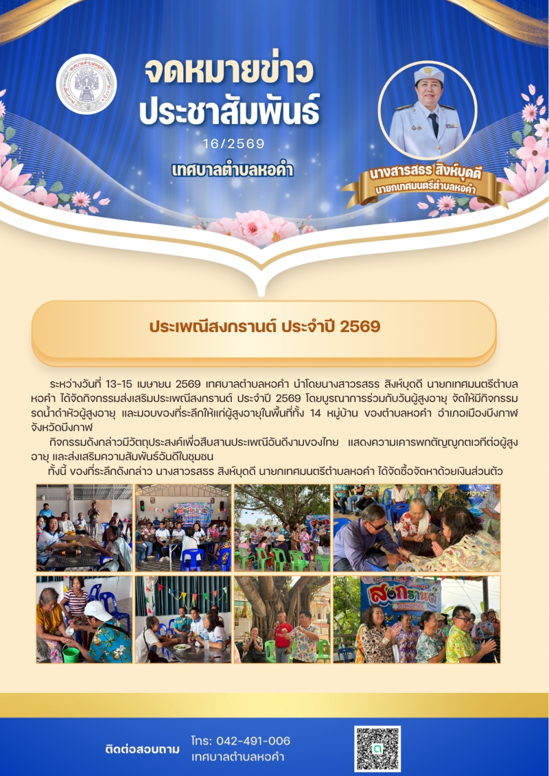 ระหว่างวันที่ 13–15 เมษายน 2569 เทศบาลตำบลหอคำ นำโดยนางสาวรสธร สิงห์บุดดี นายกเทศมนตรีตำบลหอคำ จัดกิจกรรมส่งเสริมประเพณีสงกรานต์ ประจำปี 2569 โดยบูรณาการร่วมกับวันผู้สูงอายุจัดให้มีกิจกรรมรดน้ำดำหัว